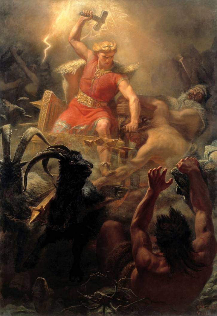 Marten Eskil Winge (1825–1896) foi um pintor sueco ligado ao movimento nacional-romântico do século XIX, conhecido por transformar temas mitológicos nórdicos em grandiosas cenas de força, heroísmo e drama. Formado na Academia Real de Belas-Artes da Suécia, aperfeiçoou-se em Paris e Düsseldorf, onde absorveu o rigor acadêmico e o gosto pelo épico. Winge destacou-se especialmente por suas interpretações da mitologia escandinava, como deuses, heróis e batalhas lendárias descritas nas Eddas, sempre retratados com intensa emoção, contrastes luminosos e composição teatral.